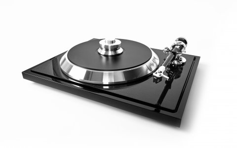 Thanks to new materials like Carbon Fibre and Termoplastic Elastomer Eat was designing a new superflat table. The low profil base chassis is made out of highest density MDF. Because of its flatness this base sits perfectly stable on any surface! On this base the ultra low noise motor is mounted as well as 10 damping feets out of energy absorbing TPE (Termoplastic Elastomers = Hightech high energy absorbing damping material). The cone shape TPE columns carry a SANDWICH subchassis out of Carbon Fibre and MDF composite with ultimate rigidity. The stiffness is important to be a super rigid base for the tonearm/cartridge and bearing/platter as there must be 100 % no moving tolerance between the distance of the groove and the tracking cartridge. All the rumble of the platter / bearing is directed in the TPE columns. On opposite the TPE avoid that any unwanted energie of motor and surface or surrounding vibration leads to the subchassis or even to the tonearm cartridge. The bearing is an oversized inverted with a inert, resonance free ceramic ball on top Around the bearing we set a super heavy 700g mass point which sucks up all energy arround.The stiff carbon subchassis helps to transport all vibration in this mass point. So vibrations are transferred in heat The platter intself is from a special alloy of very inert aluminium and is also damped by TPE inserts-It from 2 parts a subplatter and a mainplatter to keep it flat although having very high mass and kinetic energie. The belt is made from special anti-static rubber. It's glued and then polished. The tonearm itself is a completely new design which combines all advantages of a unipivot arm with a cardan design. The uni-pivot in the middle only helps bearing to be less loaded. The traditional Cardan bearing insures high stabilty and easy ness of use with very low friction. Also inside the tonearm is a special silicon-based grease to damp the tonearm / cartridge resonances by more then 50% The tube is again out of carbon , super stiff and rigid. The headshell we made out of special light and rigid aluminium to get a perfect combination of the advantages of carbon with the better inner damping of the aluminium as well as the possibility of more tighter mounting of Highend MC cartridges. An external DC powersupply unit with an AC Generator creates new total clean power for the motors . For sure you have also 33 /45 electronic switching. A HIGHEND solution as the whole table.