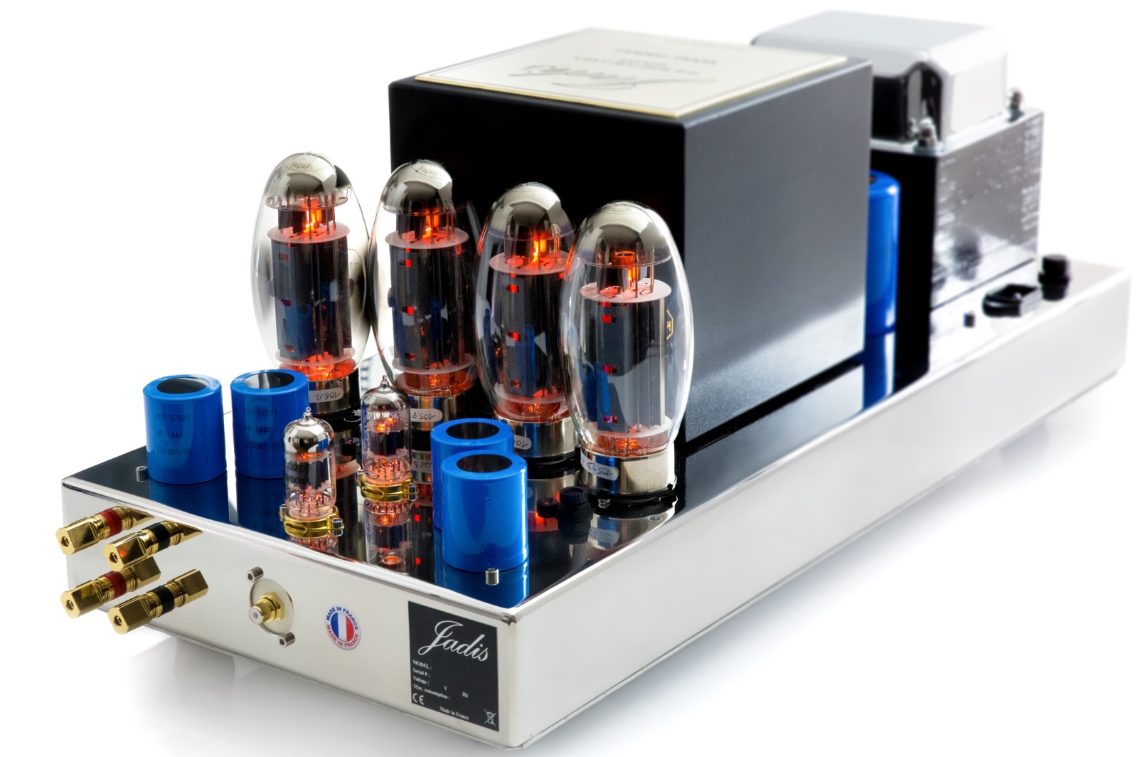 TECHNICAL SPECIFICATIONS Type: pure Class A mono valve power amplifier Valve complement: 4× KT150 power tetrodes, 1× ECC82 and 1x ECC83 double triode per channel. Other power valves can be substituted Power Output: up to 90 watts per channel Frequency Response: 20Hz to 27kHz Loudspeaker impedance: from 1Ω to 16Ω Bias: Automatic Sensitivity: 500mV Power consumption: 190W per channel Dimensions (W×H×D): 24x26x62.5cm per chassis Weight: 35kg per chassis