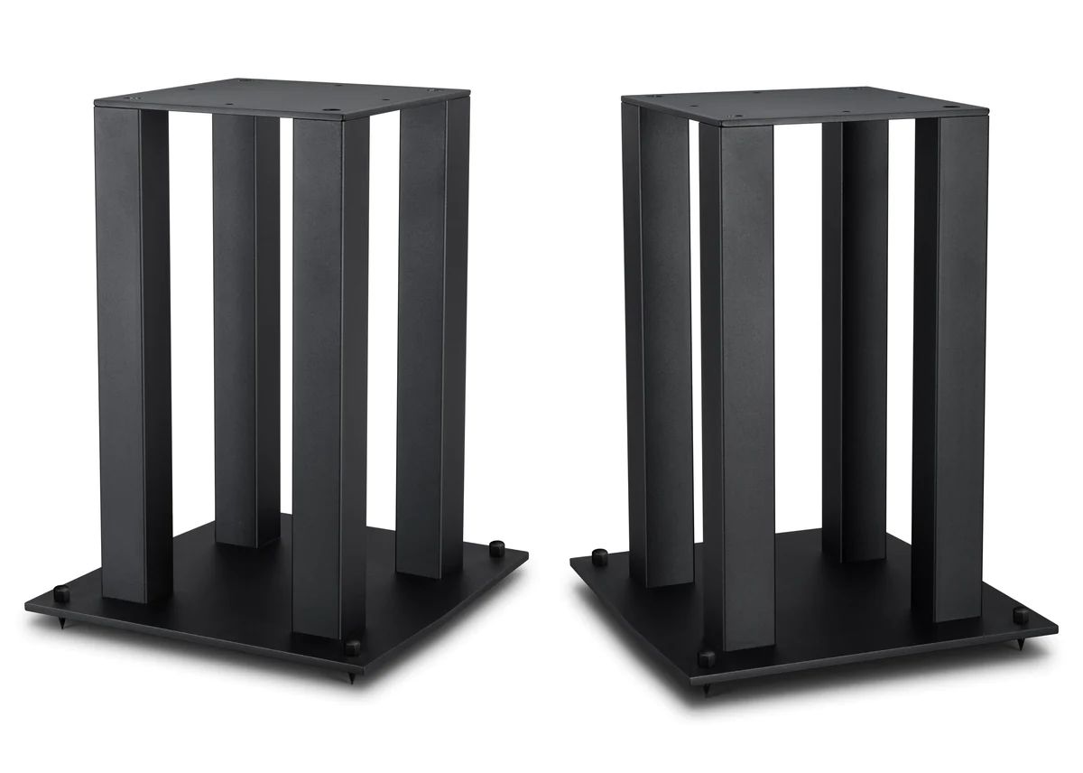 GO RIGHT TO THE SOURCE: PUT BOOKSHELF SPEAKERS AT OPTIMAL LISTENING HEIGHT, FILLABLE FOUR-PILLAR DESIGN Custom-made for Mobile Fidelity SourcePoint 10 bookshelf loudspeakers, these 22-inch-tall stands raise your speakers to the ideal listening height and provide vibration-resistant support. Made of steel, the four-pillar design can also be filled for extra stability. The top plate measures 10 x 10 (WD) inches and is 0.125 inches thick; the base plate measures 14 x 15 (WD) inches and is 0.375 inches thick. Sold in pairs. Each set comes with spikes, spike plates, and neoprene and felt pads.Read More