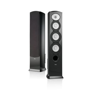 Type 3-way dual 6.5" floorstanding loudspeaker Low-frequency transducer Two 6.5" (165mm) Deep Ceramic Composite aluminum cones, with cast frames Midrange transducer 5-1/4" (130mm) Deep Ceramic Composite aluminum cone, with cast frame High-frequency transducer 1" (25mm) Beryllium dome, with acoustic lens waveguide Recommended amplifier power range 50 – 200 Watts RMS Frequency response 44 Hz - 40 kHz (-6dB) Low-frequency extension 33Hz (–10dB); 36Hz (–6dB); 48Hz (–3dB) Nominal impedance 8 ohms Sensitivity (2.83V/1m) 90 dB Crossover frequencies 260Hz; 2.1kHz Enclosure type Bass-reflex via front-mounted port Inputs Dual gold-plated binding posts with shorting straps Available high-gloss finishes Black, White, Metallic Silver, and Walnut Dimensions – with grille (H x W x D) 41.3” x 9.8” x 13.7” (1050mm x 249mm x 347mm) Cabinet Weight 58.0 lb (26.4 Kg) Grille Weight 0.8 lb (0.4 Kg)
