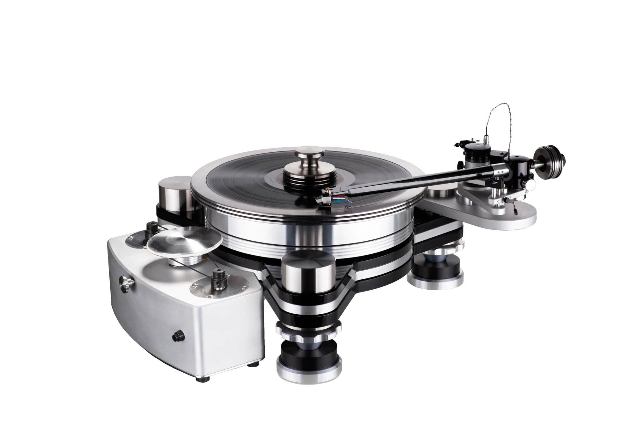 The Avenger chassis is three layers of bonded acrylic/aluminum/acrylic with damping material between layers. 3 stainless steel corner posts for both isolation and tonearm mounting and for mechanical grounding (up to 3 will fit). Analog Drive System (ADS) for the utmost accuracy in motor speed and fine speed adjustments. Periphery Ring clamp for the ultimate in record warp reduction The 300 RPM, 24 pole, AC synchronous motor in machined aluminum Rim Drive Motor assembly. The Inverted bearing features a hardened stainless steel shaft, 60 Rockwell chrome hardened ball, spinning in a phosphor bronze bushing, and sits on a PEEK thrust disc. The belt side load is placed at the center of the spinning bearing for zero teeter-totter effects. ? The 25 pound 6061 aluminum magnetic drive platter has an accuracy of +/- .001” in a 39” circumference. The motor pulley has an accuracy of +/- .0005” when leaving factory. JMW 12-3DR with Nordost Reference wire. Avenger Reference Feet – Machined aluminum, knurled cones set in a machined Delrin isolation pad that sites in a machined aluminum isolation pad for top of the line isolation and noise cancellation.Read More